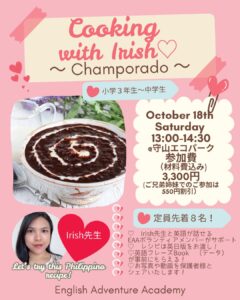 インスタグラムでも告知をしておりますが、10月18日13時からもりやまエコパーク内の調理室をお借りして、Cooking with Irish を開催いたします。